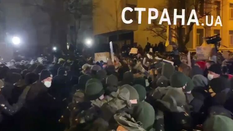 Возле здания Офиса президента, где в 20:00 начался митинг против приговора Сергею Стерненко, резко обострилась ситуация. Толпа протестующих наседает на полицию и откровенно ее провоцирует.