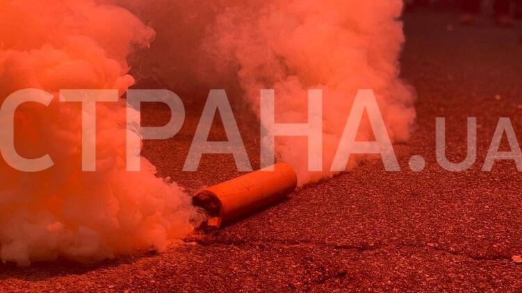 Митингующие обклеили ограждение президентской резиденции наклейками и зажгли файера и дымовые шашки.
