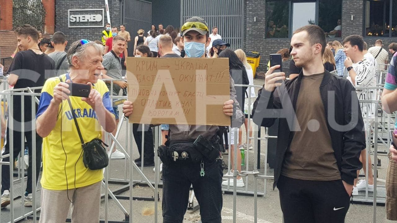 Перед началом выступления рэпера выстроились две очереди на вход, между ними стоит четыре националиста, у одного плакат с надписью: "Крым - Украина, Баста - оккупант, пришел на концерт Басты - оплатил пули врагам!!!".