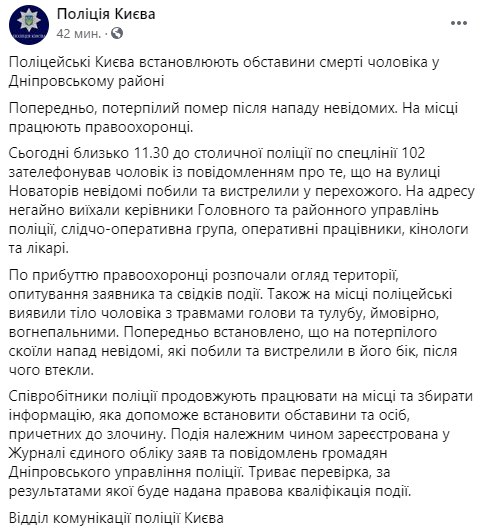 Убийство произошло в районе столичного ДВРЗ, по улице Новаторов в Днепровском районе. На мужчину напали неизвестные, после чего избили и выстрелили в голову. Однако, злоумышленники вскоре скрылись.