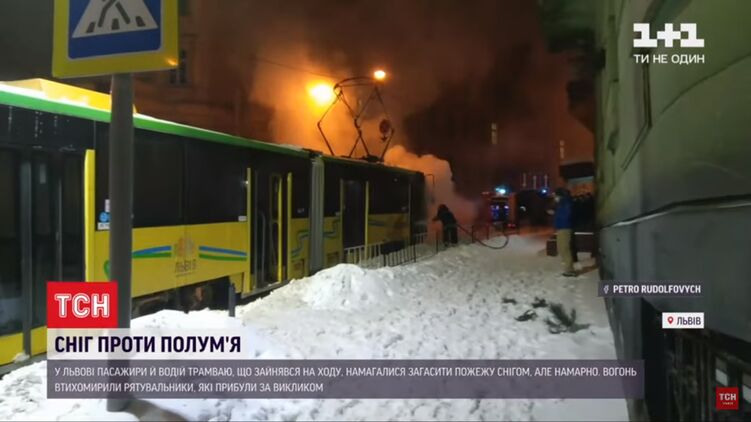 В понедельник, 8 февраля, в центре Львова загорелся трамвай с пассажирами. Люди пытались потушить его снегом.