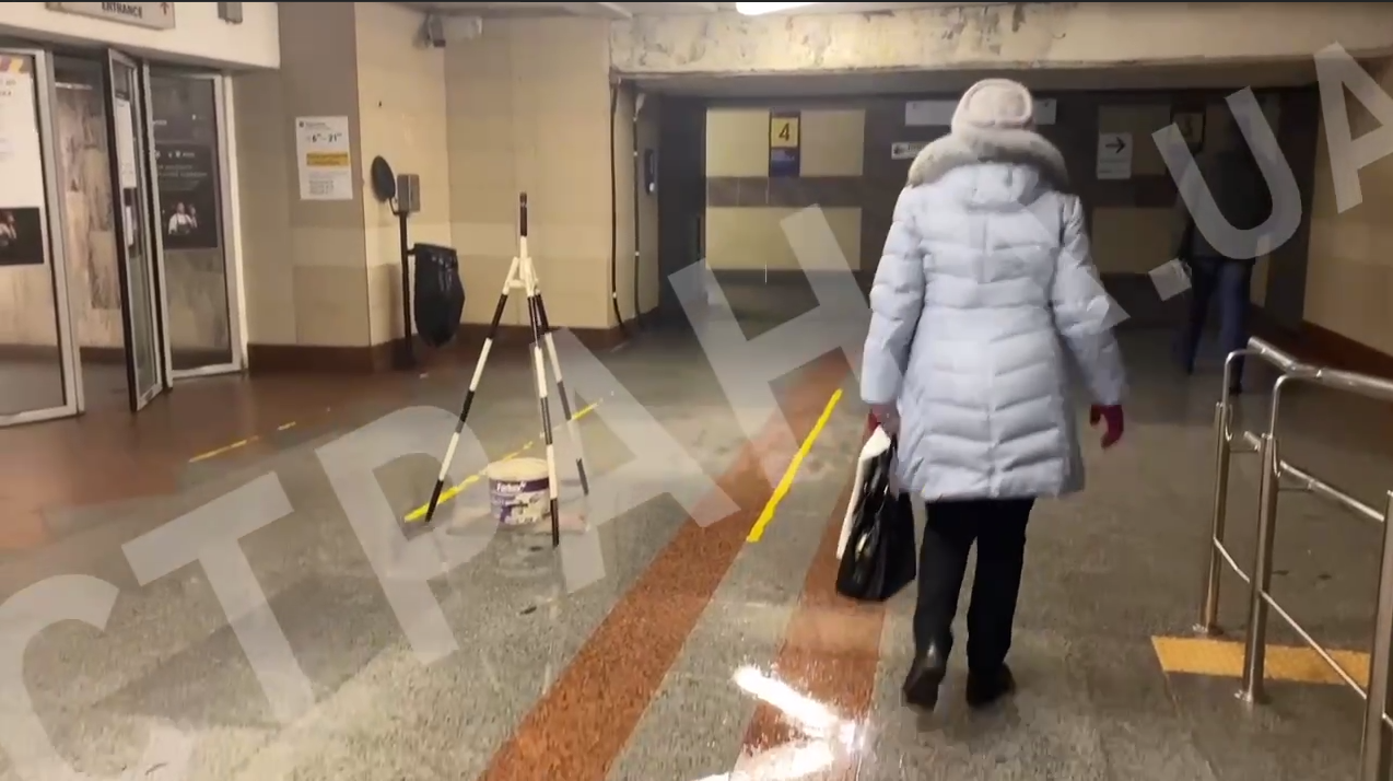 У входа на конечную станцию Оболонско-Теремковской линии Киевского метрополитена "Теремки" с потолка течет вода.