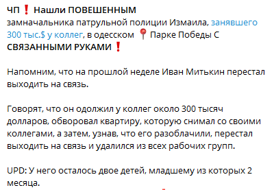 В понедельник, 26 июля, в Одессе нашли тело заместителя руководителя патрульной полиции Измаила Ивана Митькина, который обворовал квартиру, занял крупную сумму денег, а затем подался в бега. Пропавшего правоохранителя обнаружили повешенным в парке Победы.