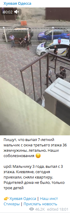 Как сообщает Тelegram-канал "Х@@@ая Одесса", трагедия произошла в семье киевлян, которые приехали в Одессу вместе с тремя детьми и сняли квартиру, а в момент, когда ребенок выпал из окна, родителей не было дома и дети остались одни.